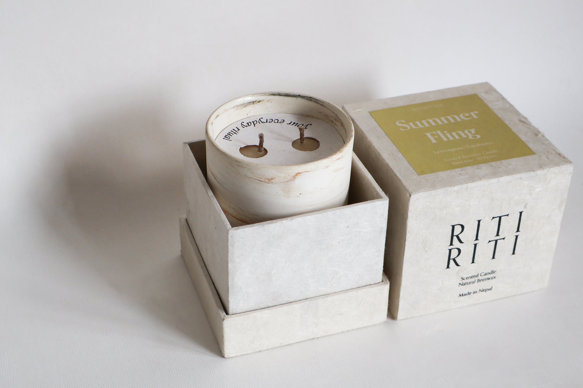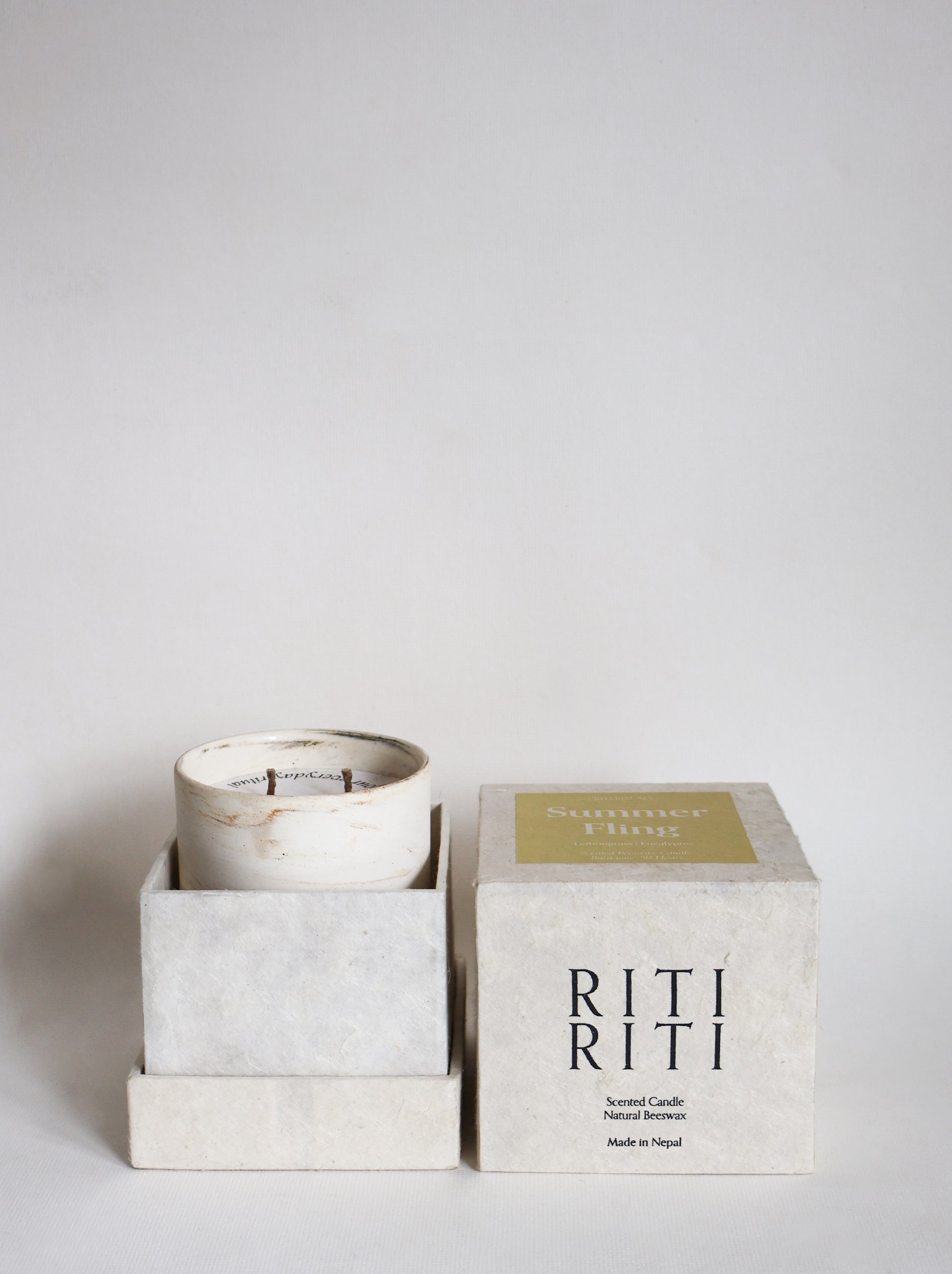 The Ceramic jar for the candles are reusable and hand made in Bhaktapur. Focusing on local artisans and sustainability, our packaging is created by hand recycled Nepali paper with block printing. We also use hemp wicks which allow for a slower and cooler burn time.